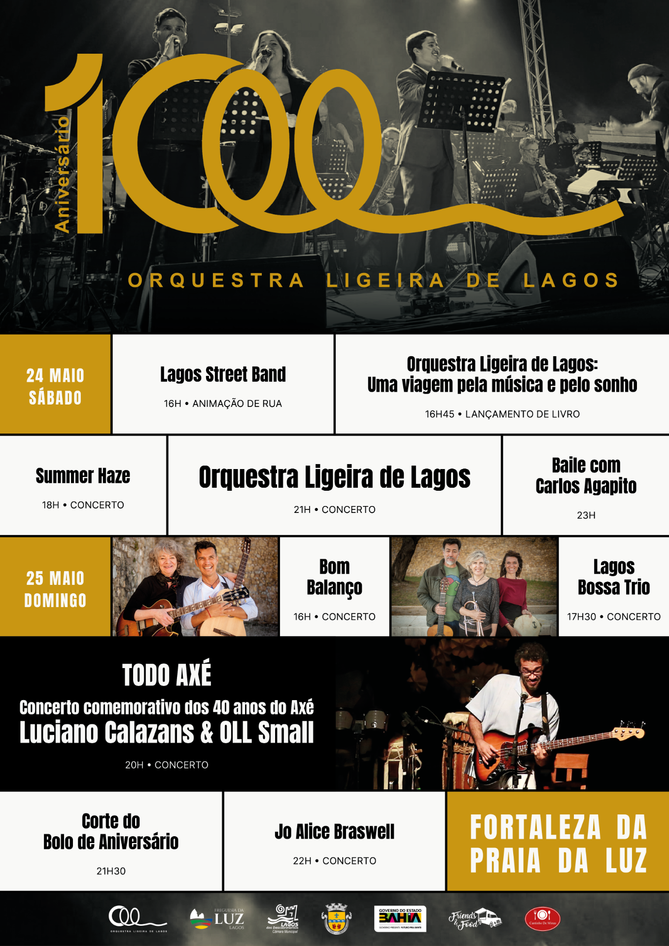 A Orquestra Ligeira de Lagos celebra 10 anos! Uma década de música, sonhos e muitas histórias para contar, e nada melhor do que festejar consigo. Nos dias 24 e 25 de maio, a Fortaleza da Praia da Luz vai encher-se de música, animação e boa energia para marcar esta data tão especial. Para tornar a festa ainda mais inesquecível, contará com as presenças de Luciano Calazans & Tais Nader, vindos diretamente da Bahia (Brasil), para um concerto único a celebrar os 40 anos do Axé, acompanhado pela OLL Small. Ao longo do evento, não vão faltar comes e bebes para dinamizar ainda mais o ambiente.
